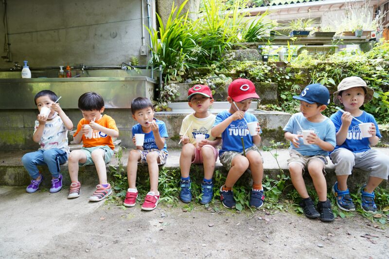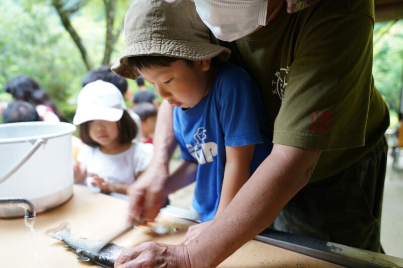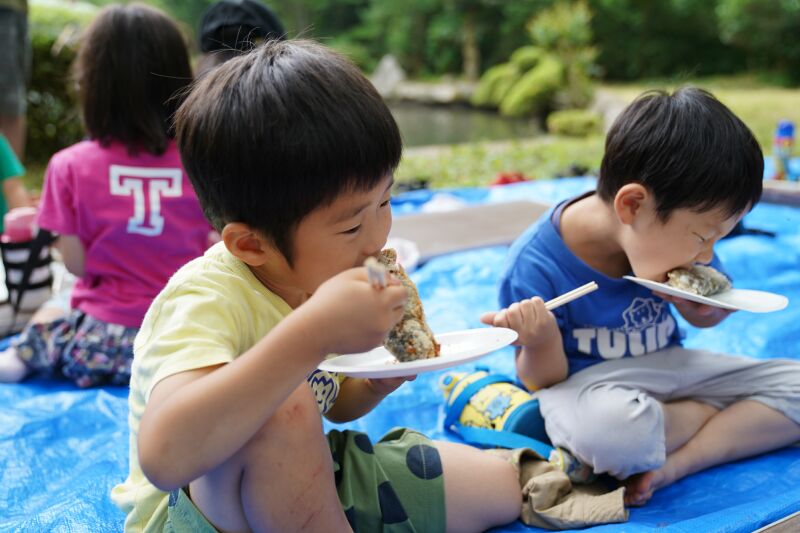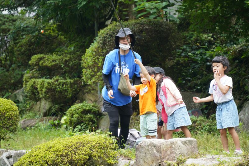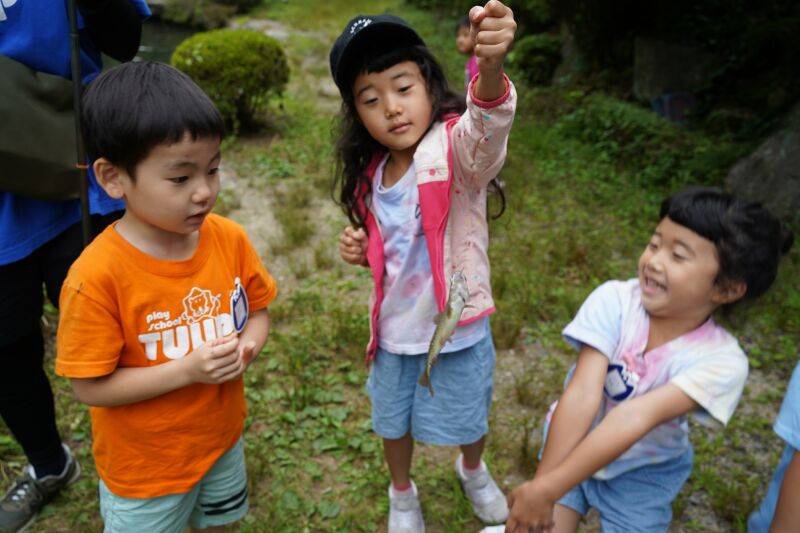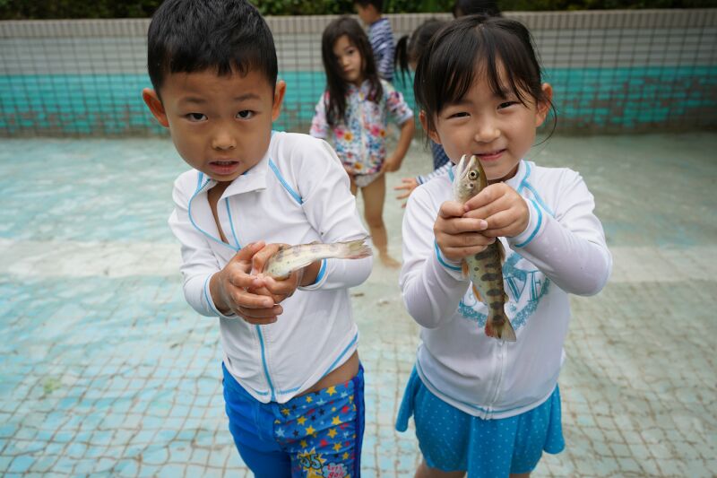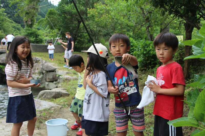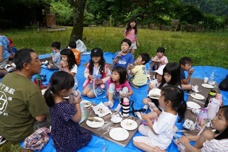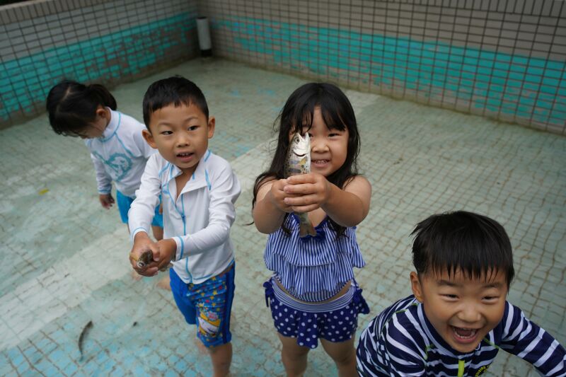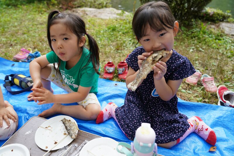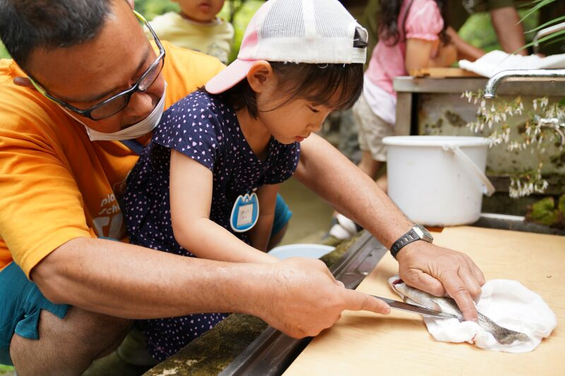 朝は「おはようございます。」と寝起きの良い子ども達☆「今日は魚釣りするぞ!」と張り切って目覚めました♬朝の洗顔、着替えを終えて身辺整理が済んだら朝食の準備のお手伝いをして朝ご飯のパンケーキをいただきました☆それから大きなバックをバ スに乗せて釣り堀へ出発~🎵年中さんはつかみ取りの準備・年長さんは5人組3チームに分かれて魚釣り・つかみ取りがスタートしました☆各会場からは「タイミング合わせて上げて」「大きい魚釣れたよ~」「ダブルで捕まえたよ~」と盛り上がりの声が聞こえました!それからまな板の上で魚の下ごしらえをしてしっかりと魚に触れてお腹の中身もじっくりと観察しながらさばきました。お昼にはカリっと天ぷらになって登場!「お魚の命をいただきました」午後からはお散歩したりおやつのかき氷をいただいて家路に帰りました。