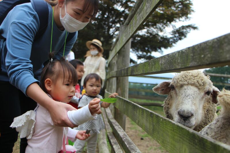 ヒツジさんに葉っぱのご飯をあげようね~♪